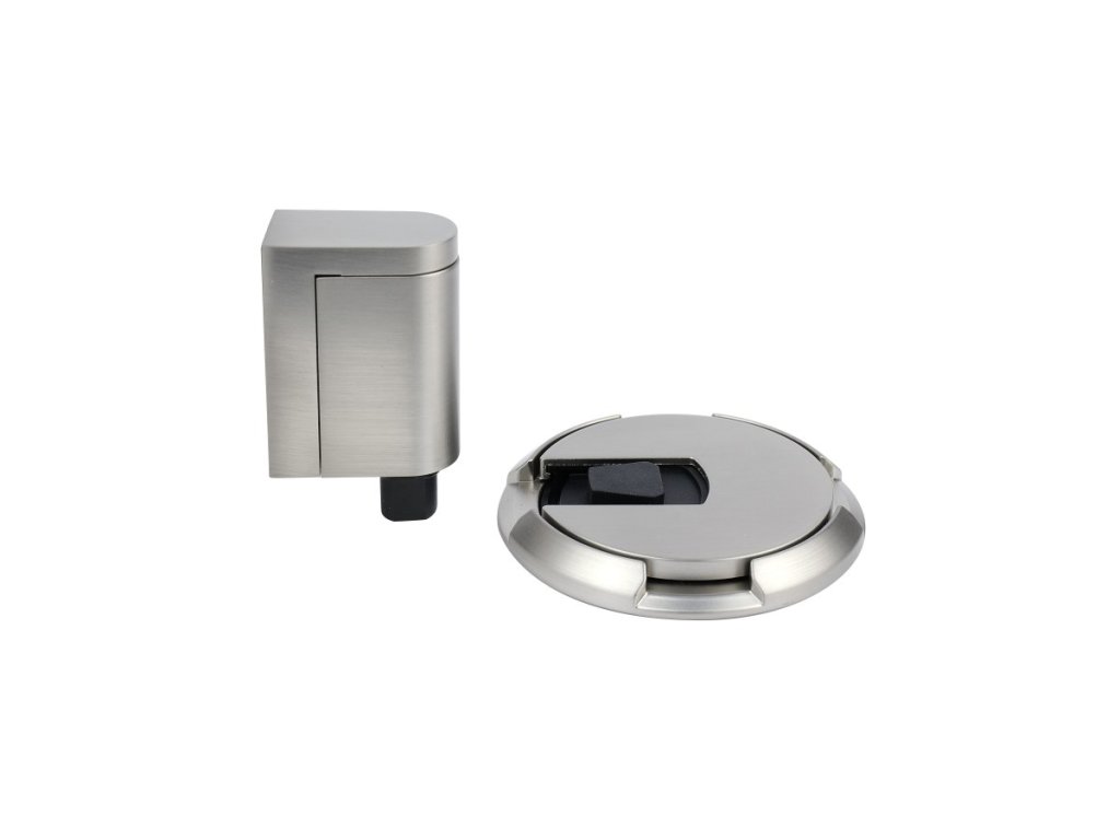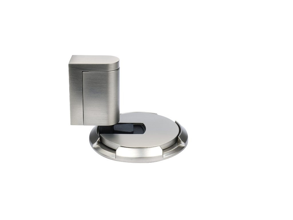 - Zarážka se zajistí otevřením dveřního křídla do spodní části zarážky (umístěné na podlaze) pootočením vnějšího prstence. Opětovným zatlačením do dveřního křídla zarážku odjistíte (vnější prstenec se pootočí do otevřené polohy).