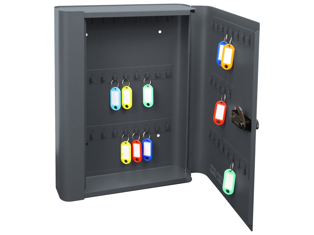 Tato skříňka je vyrobena z odolné oceli v atraktivní antracitové barvě (AM), která jí propůjčuje moderní a nenápadný vzhled. Její optimální rozměry a promyšlené vnitřní uspořádání nabízejí dostatečnou kapacitu pro efektivní správu klíčů.